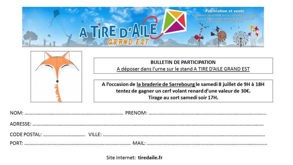 Nous organisons un tirage au sort le samedi 8 juillet 2023 sur notre stand à 17H à l’occasion de la braderie d’été de Sarrebourg pour gagner un cerf-volant Renard d’une valeur de 30€. Pour y participer vous devez remplir le bulletin d’inscription et le déposer dans l’urne qui se trouvera sur notre stand. BULLETIN D’INSCRIPTION